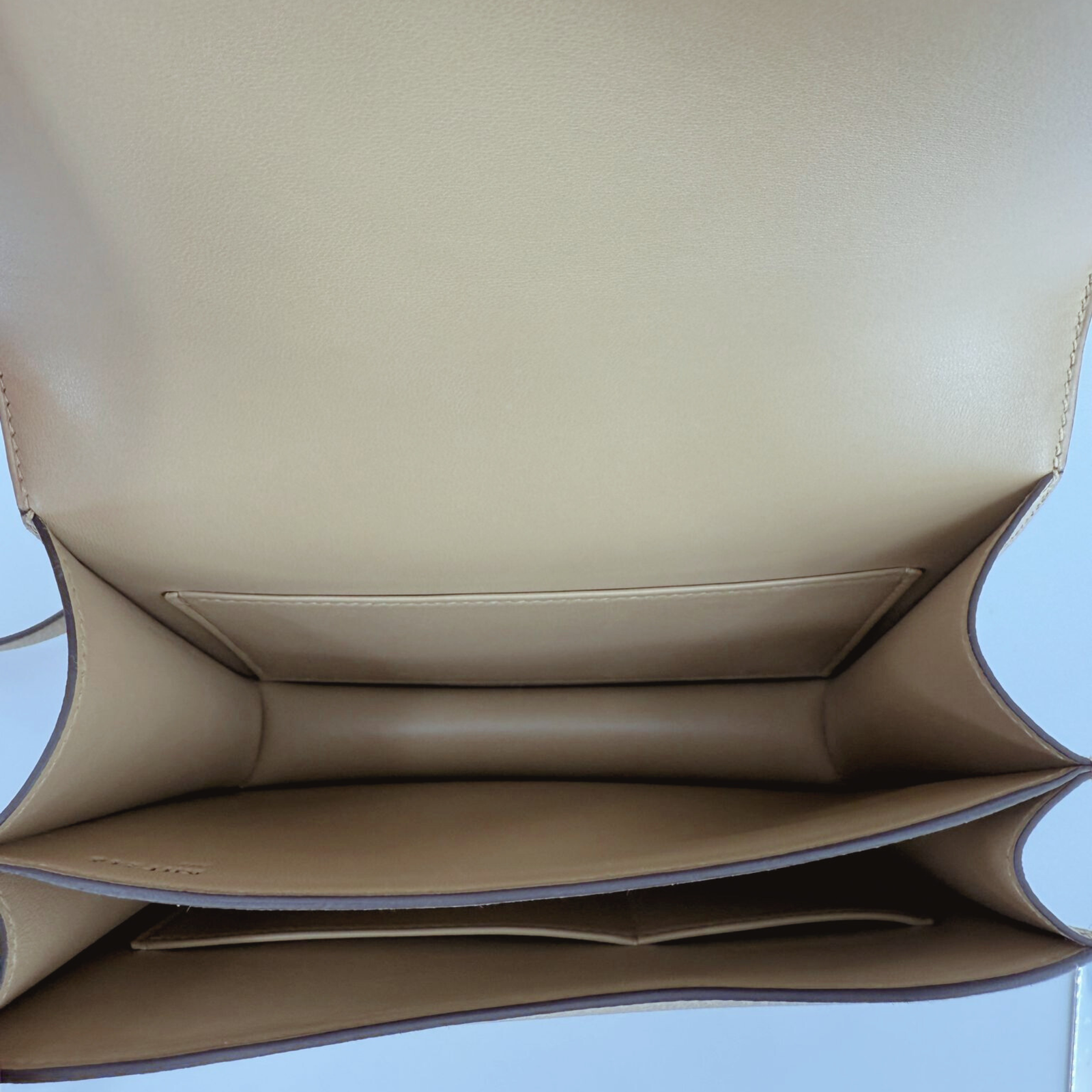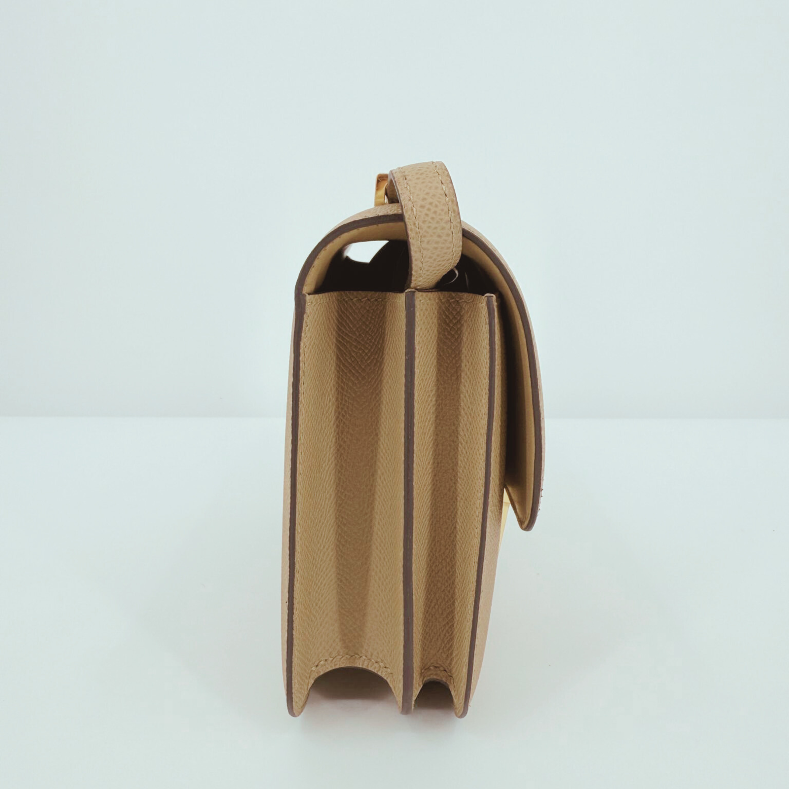 A symbol of refined sophistication, this Hermès Constance 18 in Poussière Epsom leather captures timeless elegance in a compact, structured silhouette. The soft beige hue of Poussière — translating to “dust” — offers a delicate, neutral tone that pairs effortlessly with any ensemble. Crafted from Epsom leather, known for its fine grain and lightweight durability, the bag maintains its crisp shape over time.