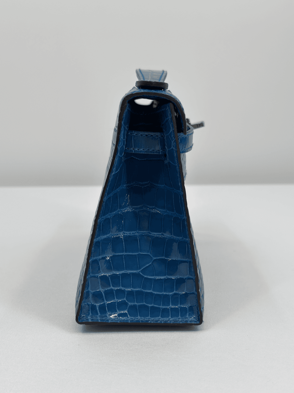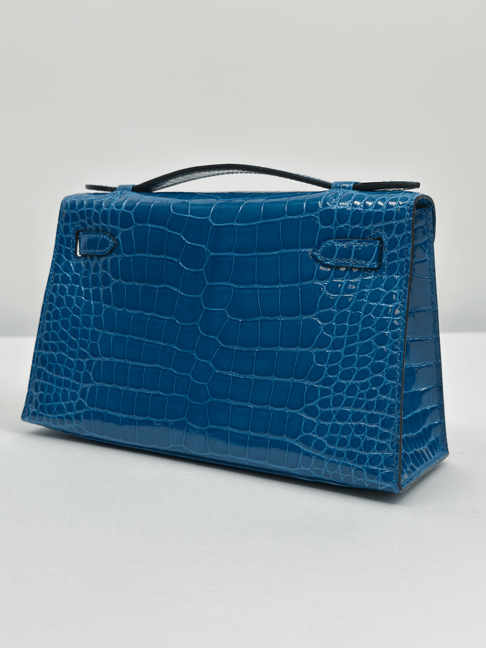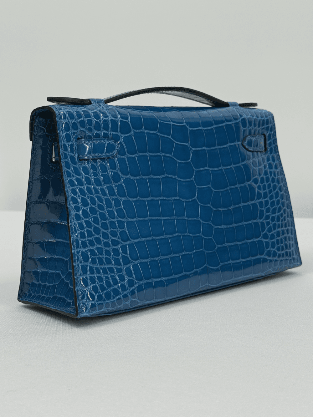 Hermès Kelly Pochette Bleu Izmir Alligator Gold Hardware.