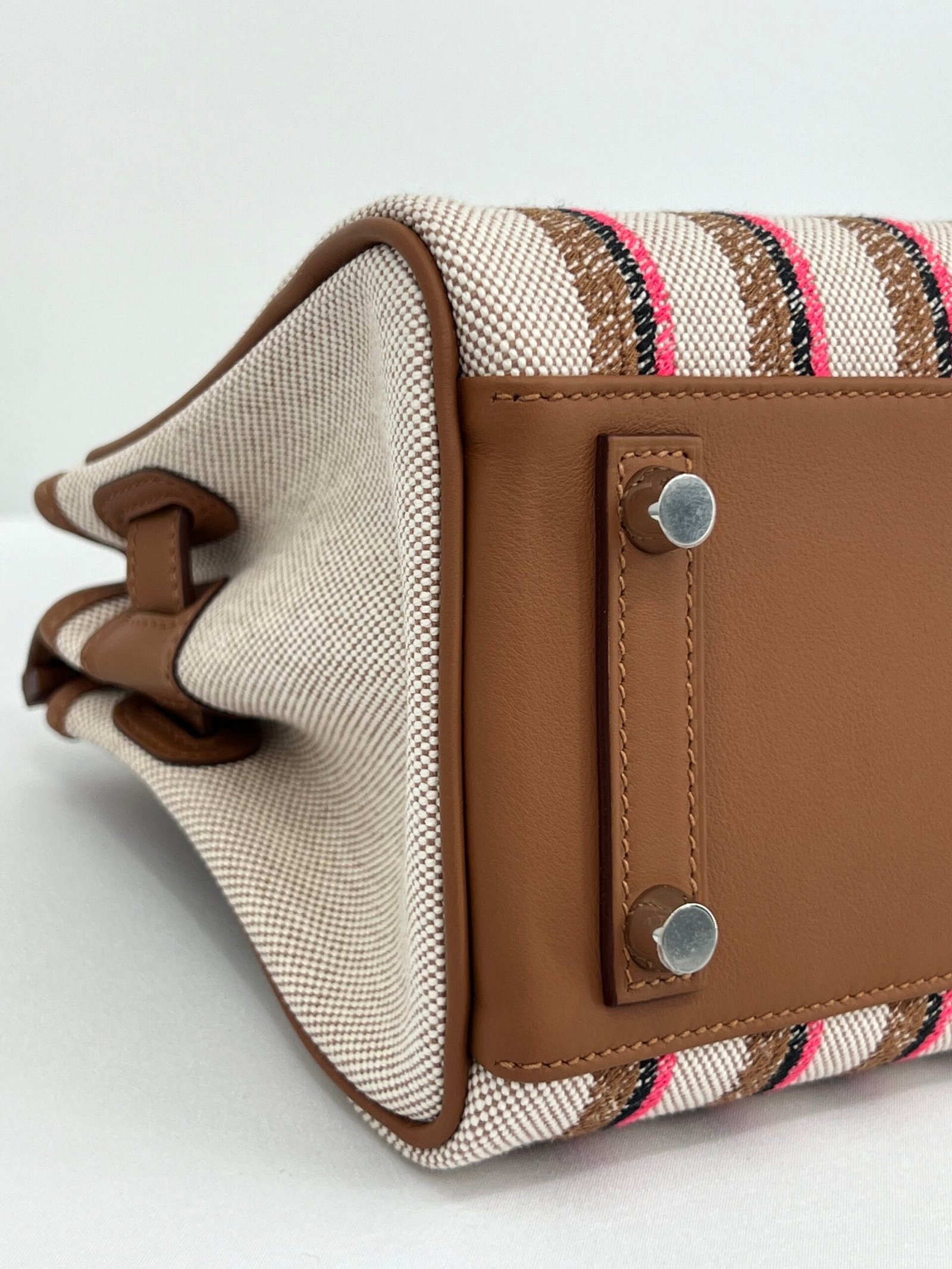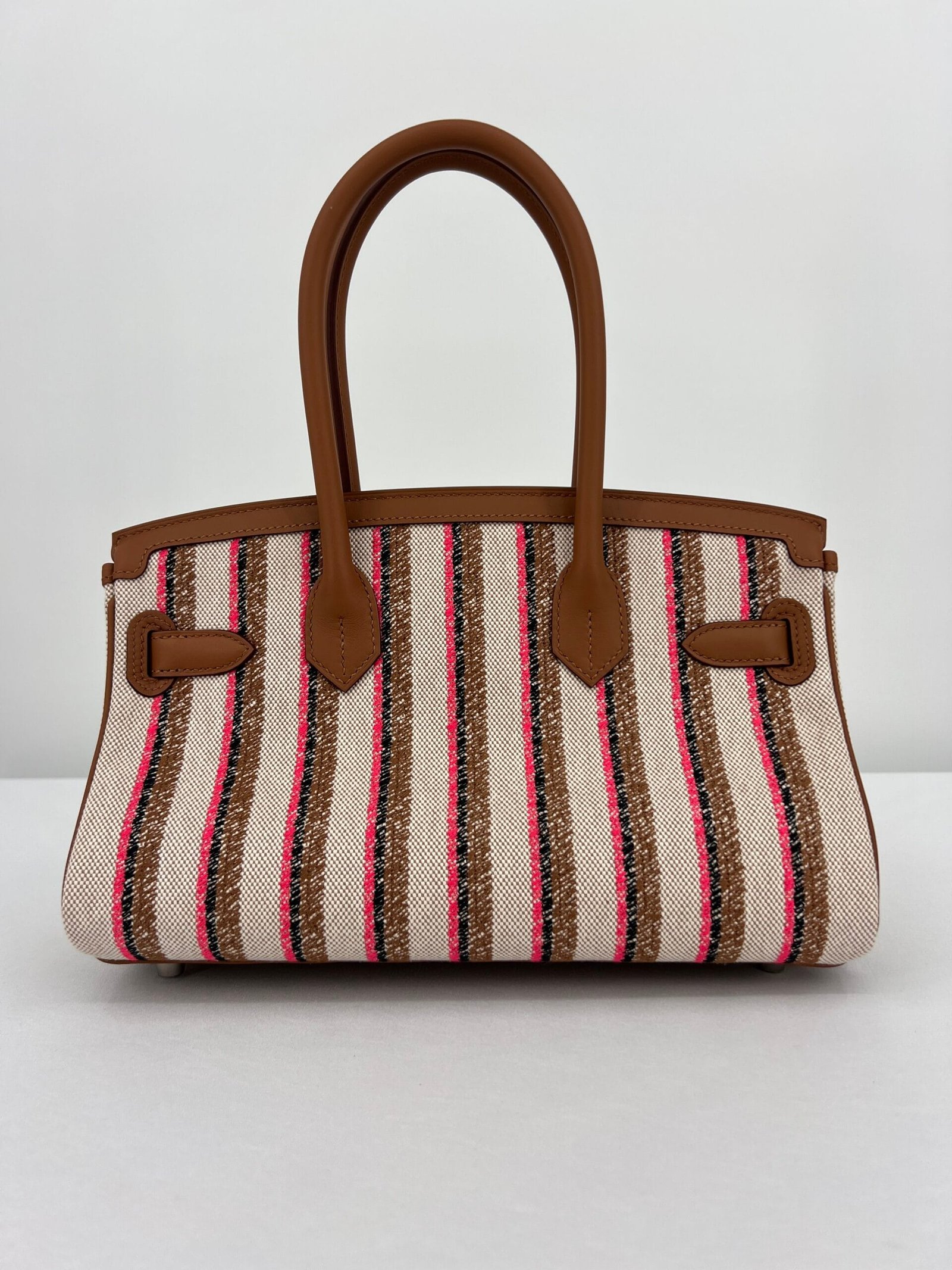 A true collector’s piece. This rare Shoulder Birkin Light 29 is crafted in multicolor toile and fauve swift leather. It features palladium-plated hardware and tonal stitching.